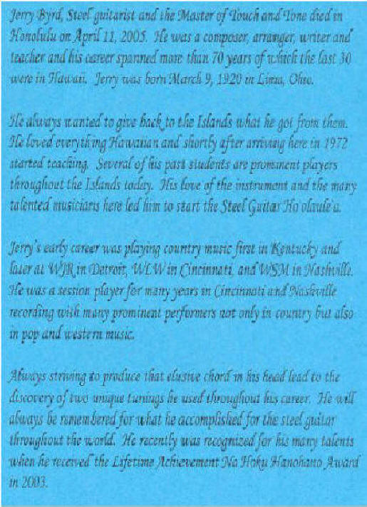 Also Michael Cord of Cord International owns the copyright of the six Monument albums Jerry recorded. I believe he purchased it from Sony a few years back He intends to issues them as CDs selecting various tunes from the six albums. The first one is titled Jerry Byrd Master of the Steel Guitar, Vol. One. If you go to his site you will find it . It is HOCD 95980 and has 15 instrumentals the URL is www.cordinternational.com